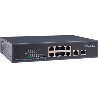 GV-APOE0810-V2 is a 10-port 10/100/1000 Mbps unmanaged PoE Switch with 8 PSE/PoE ports and 2 uplink ports. The switch supports IEEE 802.3at Power over Ethernet standard, with up to 32 W per port and a maximum power consumption of 125 W. It not only eliminates the need for power cables to connect your powered devices (PD), such as IP cameras, but it also allows power supply over cables up to 250 m (820 ft) in length, at 10 Mbps.
